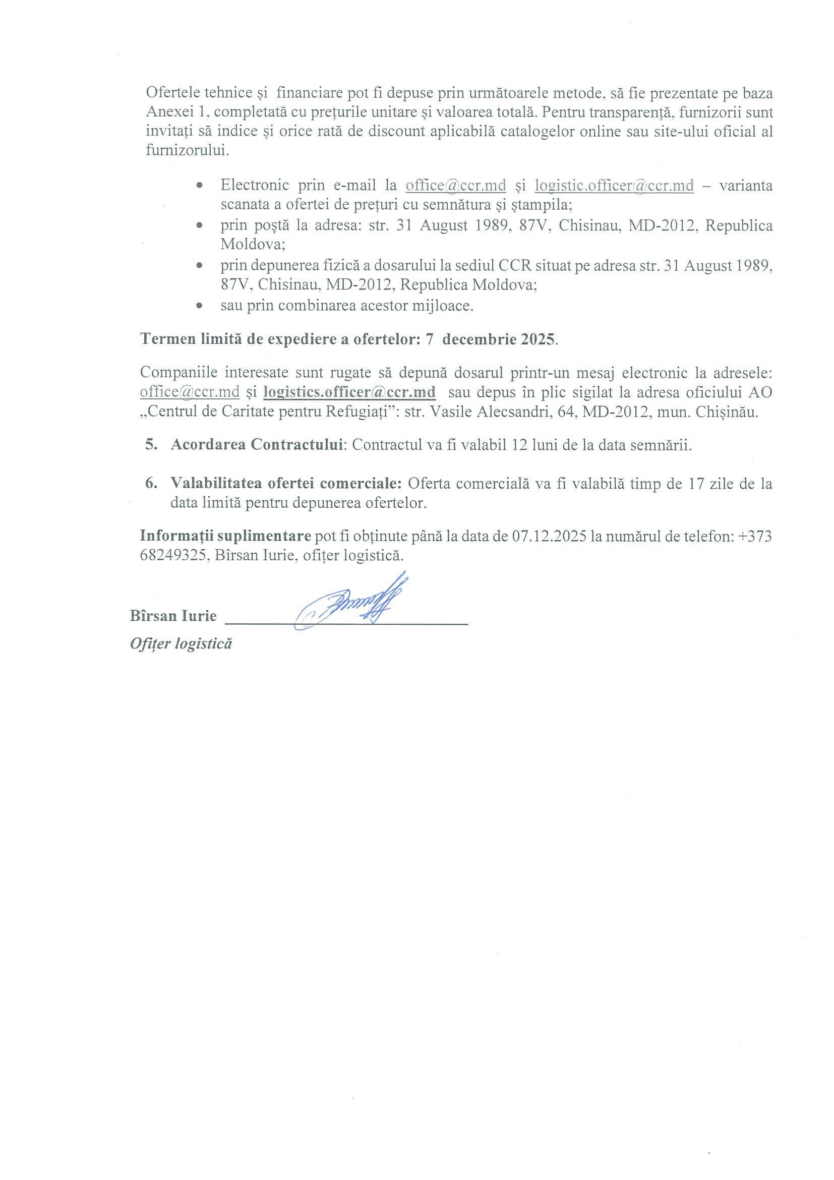 Additional information may be obtained until 07.12.2025 by phone at +373 68249325, Iurie Bîrsan, Logistics Officer.