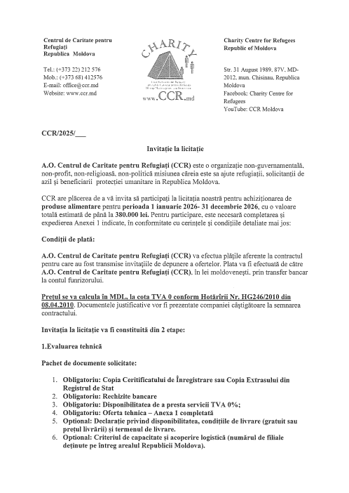 CCR are plăcerea de a vă invita să participați la licitația noastră pentru achiziționarea de produse alimentare pentru perioada 1 ianuarie 2026- 31 decembrie 2026, cu o valoare totală estimată de până la 380.000 lei. Pentru participare, este necesară completarea și expedierea Anexei 1 indicate, în conformitate cu cerințele și condițiile detaliate mai jos: