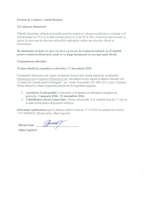 Informații suplimentare pot fi obținute până la data de 17.12.2025 la numărul de telefon: +373 68249325, Bîrsan Iurie, ofițer logistică.