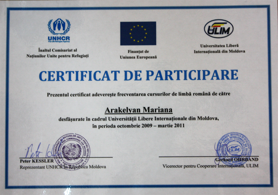 On April 8, 2011, at Free International University o Moldova (ULIM) there was held a ceremony of handing over the certificates of attendance to a group of Romanian language learners within the refugee and asylum seeking community in the Republic of Moldova.