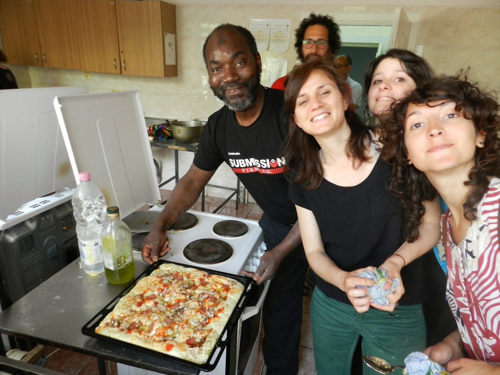 să se alăture și să ajute echipa voluntarilor italieni în prepararea unei pizze delicioasa. Comunitatea refugiaților și solicitanților de azil, împreună cu voluntarii SEV au împărţit rezultatele muncii lor intr-o atmosferă veselă, stând în jurul mesei într-o grădină cu soare.
